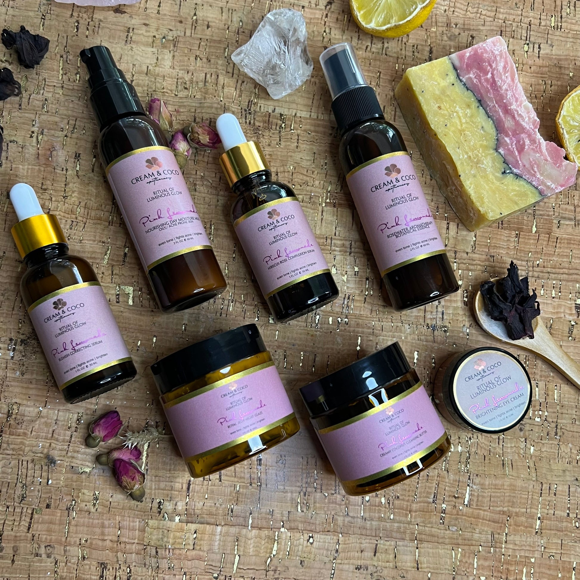Our collection features hibiscus and litsea oil exfoliating pads, renowned for their brightening properties and ability to refine texture while reducing the appearance of dark spots and uneven skin tone. Elevate your glow with our Pink Lemonade serum, a potent blend of hibiscus and rose geranium that hydrates, calms, and rejuvenates for a smooth, radiant complexion.