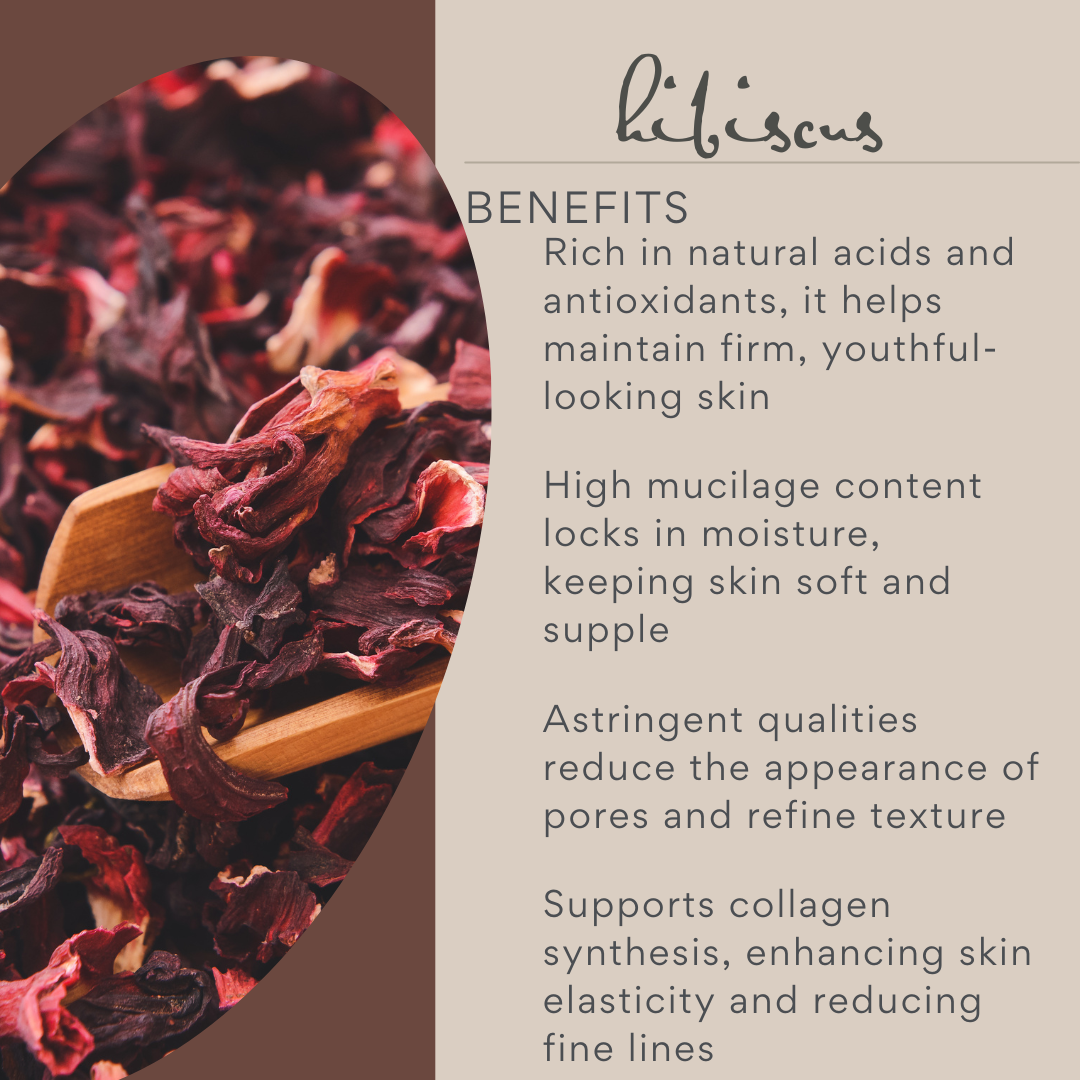 - Hibiscus gently exfoliates, boosts elasticity, and promotes a youthful glow with its natural AHAs and antioxidants.