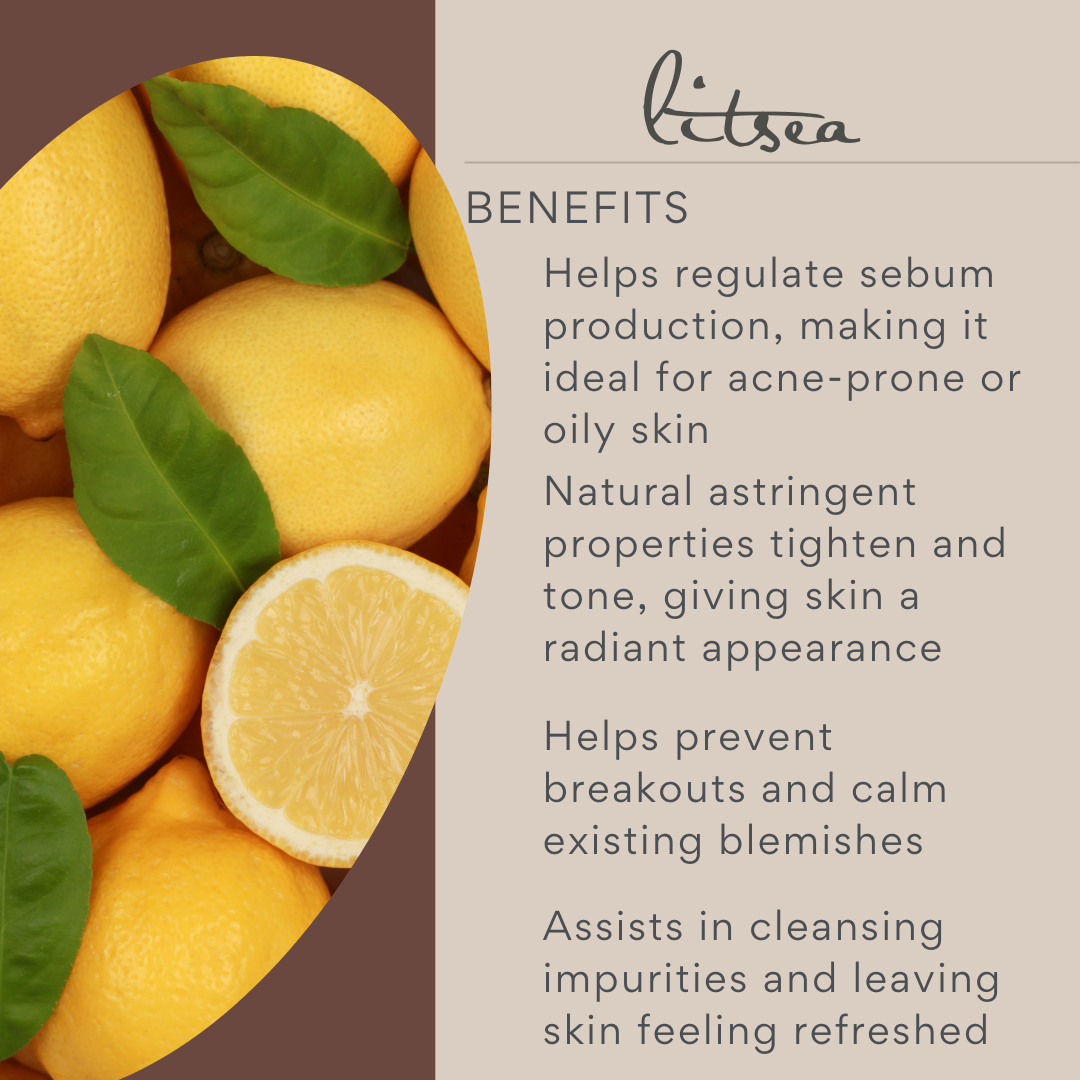 - Litsea Oil balances oily skin, brightens the complexion, and combats breakouts with its antimicrobial properties.