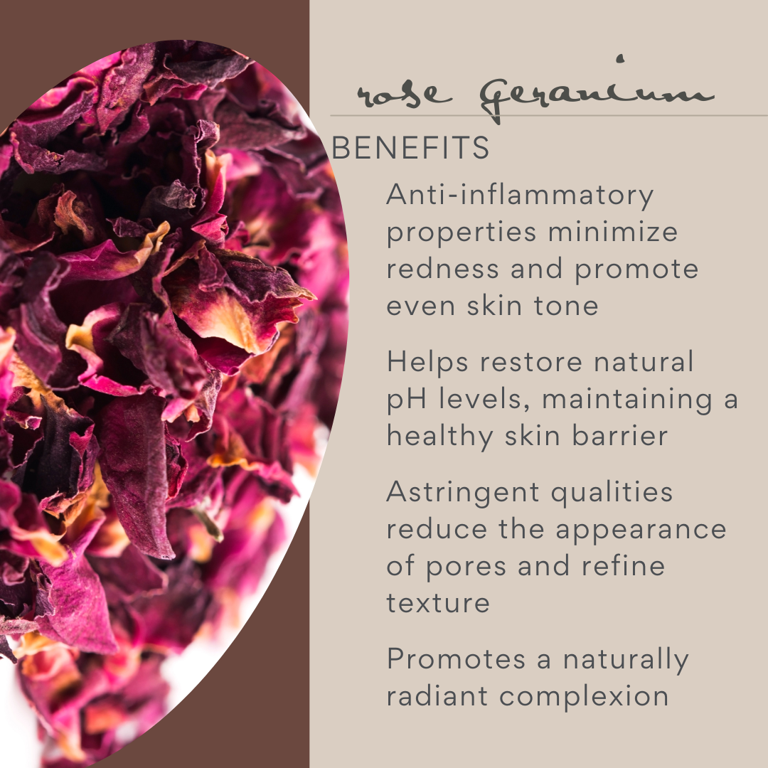 - Rose hydrates, soothes, and reduces redness, enhancing skin’s natural radiance.